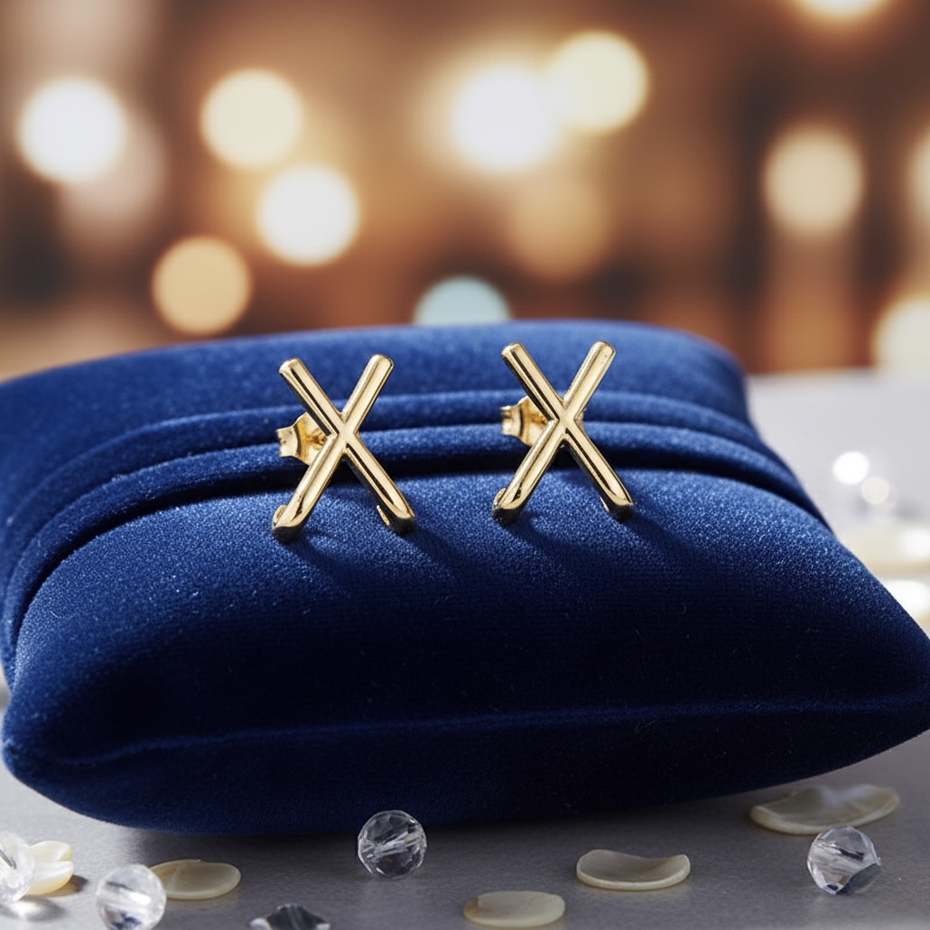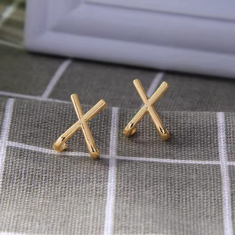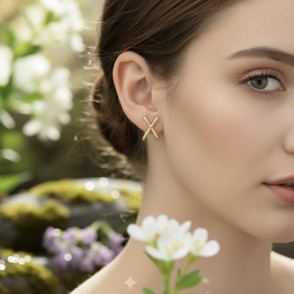 Description: These contemporary stud earrings feature a highly polished, gold-toned design shaped like a stylized 'X' or cross. The three-dimensional structure and smooth, bright finish create a bold yet minimalist aesthetic, perfect for those who appreciate modern, architectural jewellery.