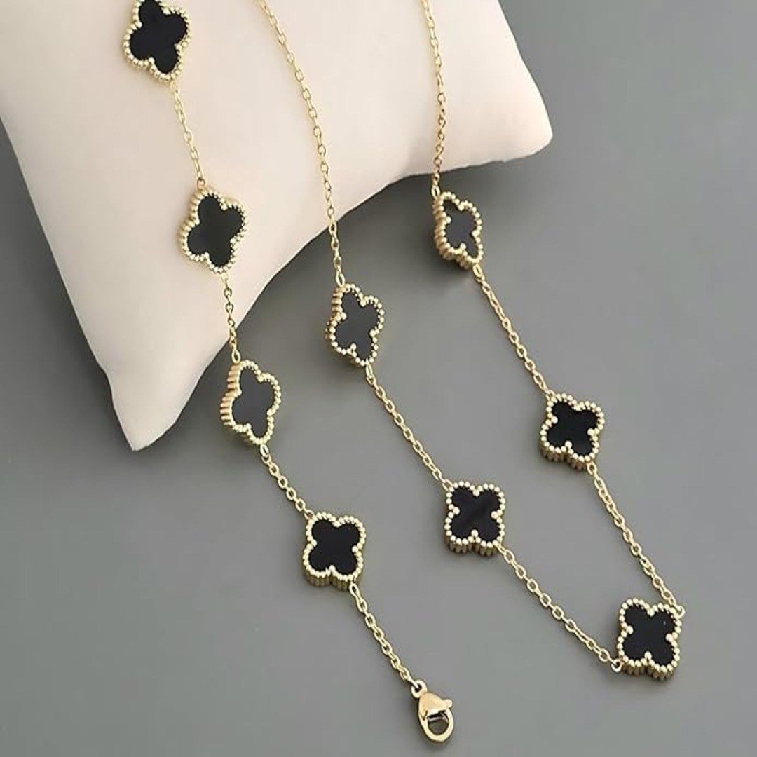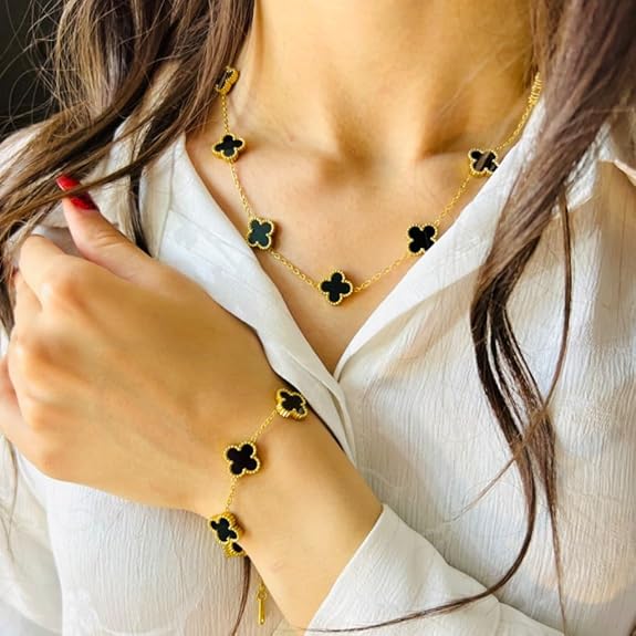 Grace your everyday style with the Pavona Ratna Classic Clover Elegance Set. Featuring delicate black clover motifs on a polished gold finish, this necklace and bracelet set adds a touch of refined charm to any outfit. Designed with an anti-tarnish coating, it’s made to stay beautiful wear after wear.