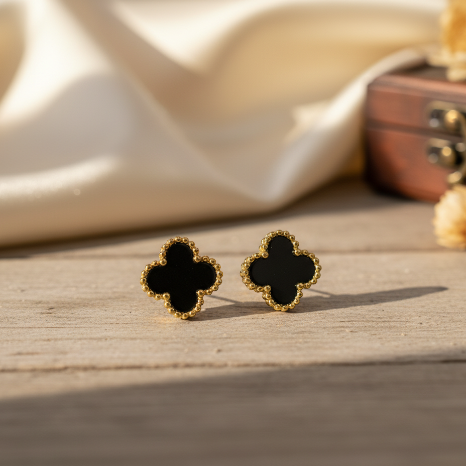 Style Tip: Embrace the drama by wearing the Triple Band Hoops with a structured blazer and tailored trousers. For a more subtle look, pair the Black Clover Studs with a crisp white shirt to let the classic black and gold contrast stand out.
