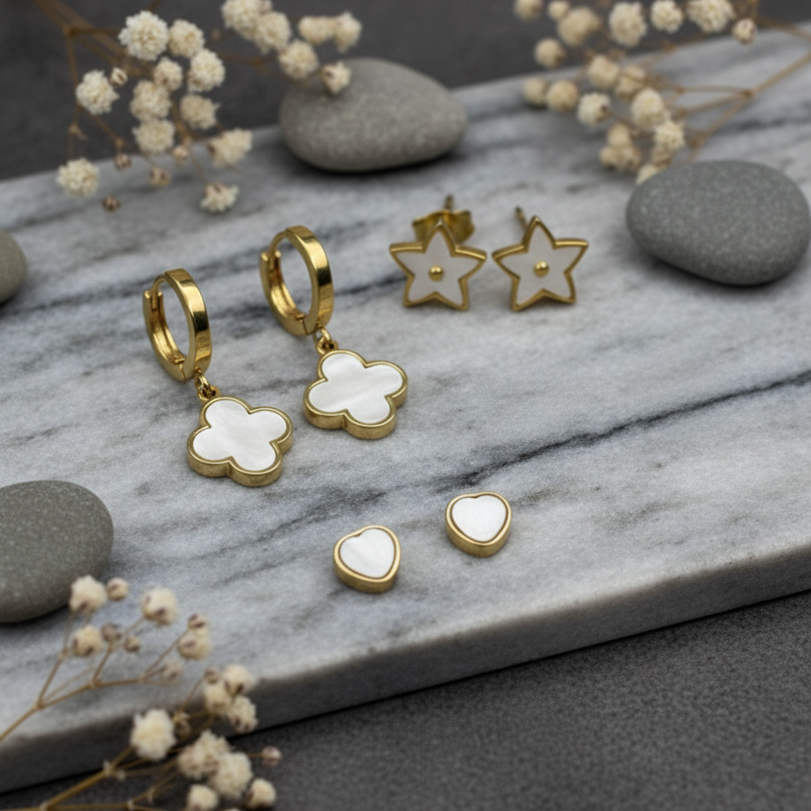 Description: Discover the perfect blend of natural elegance and whimsical charm with this exquisite three-pair earring set. It includes delicate Clover Dangle Hoops featuring luminous white shell, classic Star Studs with a pearlized inlay, and tiny, sweet Heart Studs. Each piece is finished in a high-quality, anti-tarnish gold tone, making this set a brilliant and durable choice for everyday wear, gifting, or building a romantic, layered ear stack.