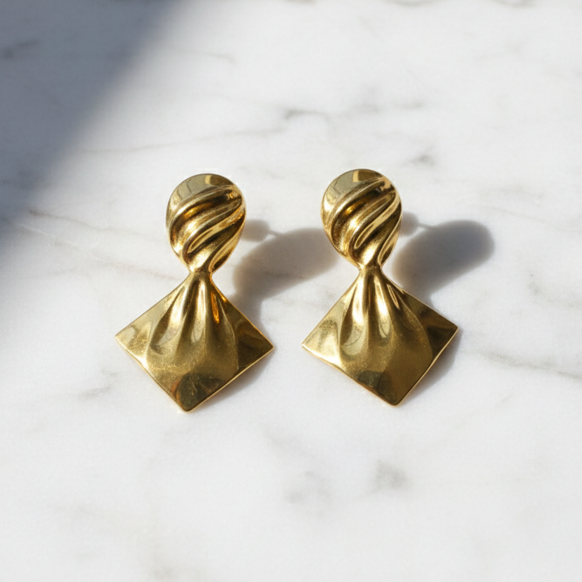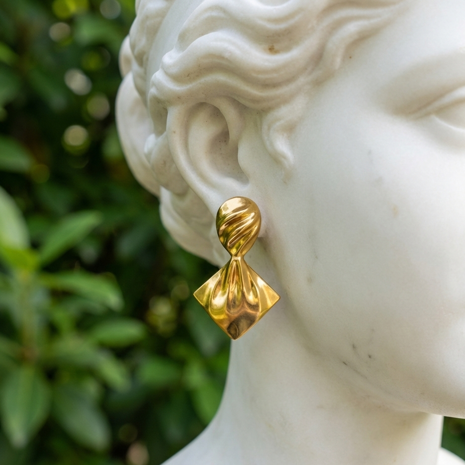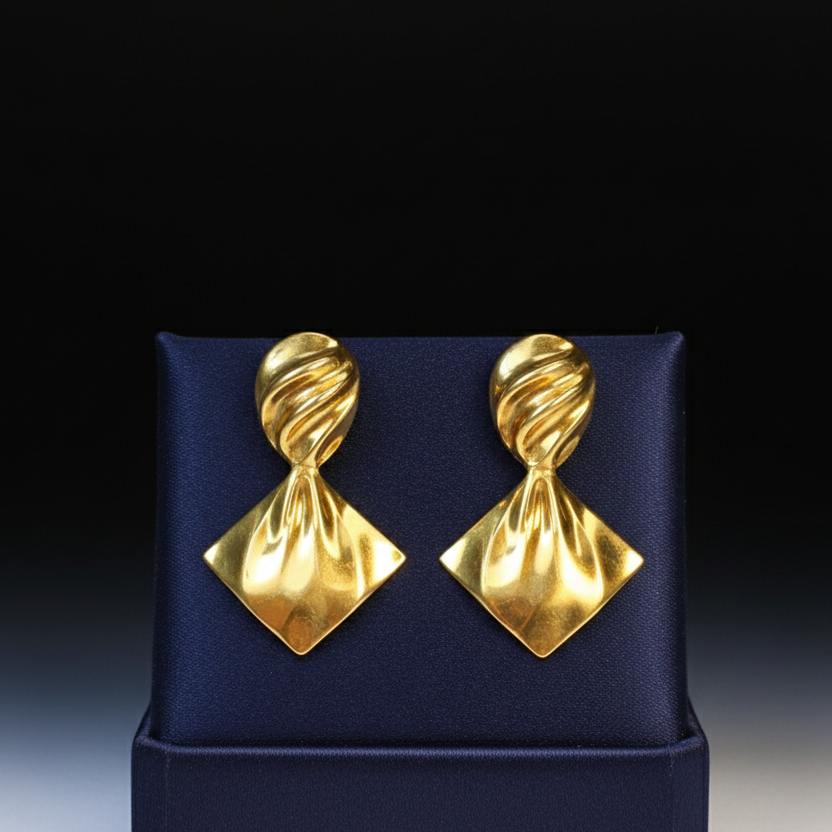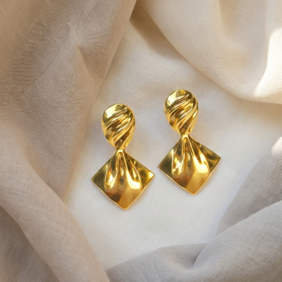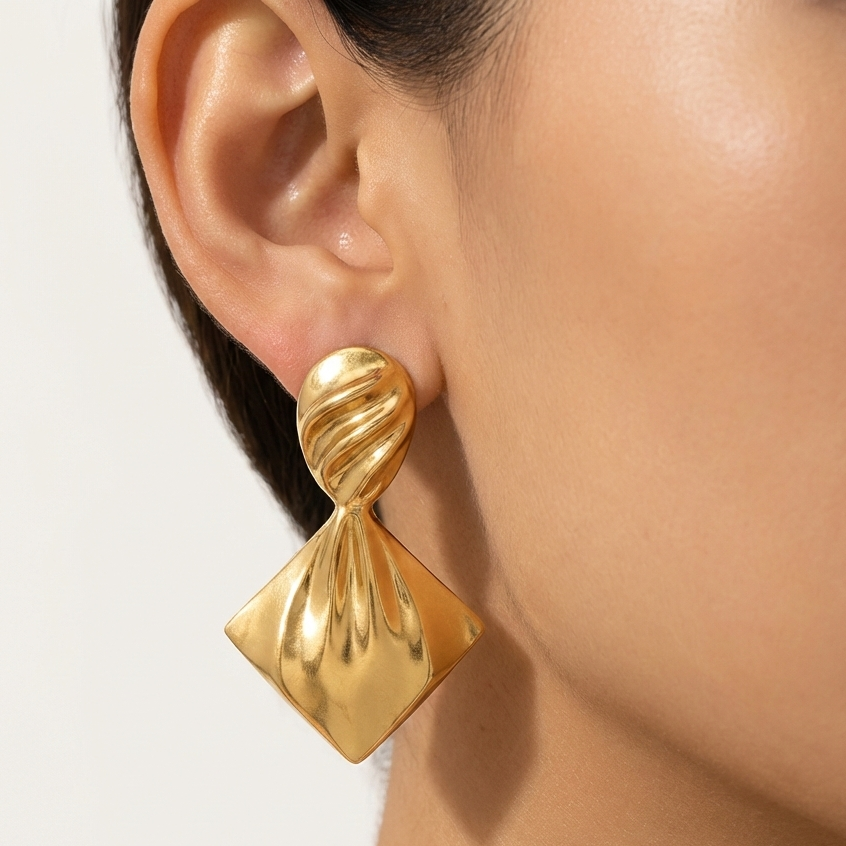 Bold yet refined, these stud earrings feature a sculpted twisted top flowing into a fan-shaped silhouette with a high-polish gold finish. Designed to make a statement without overpowering, they add modern elegance and artistic flair to both everyday and occasion looks. Design Style: Twisted Fan Sculptural Design Earring Type: Stud Earrings Finish: High Polish