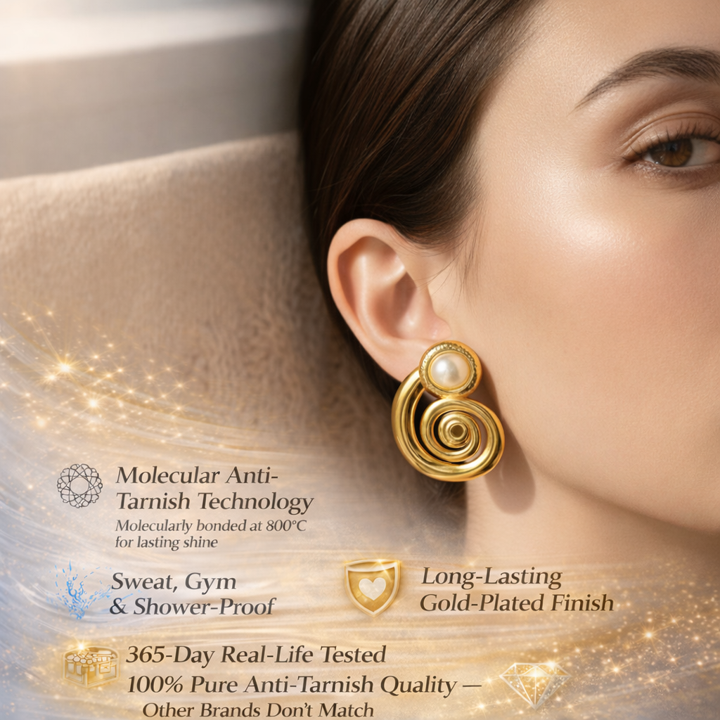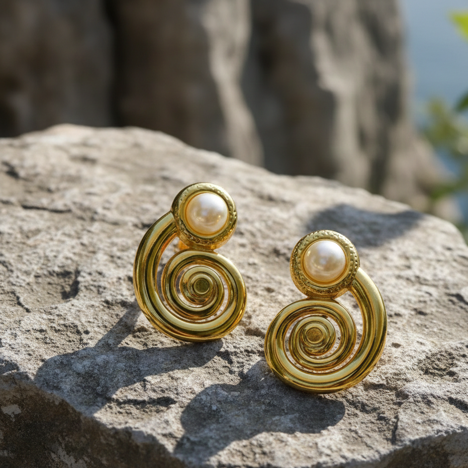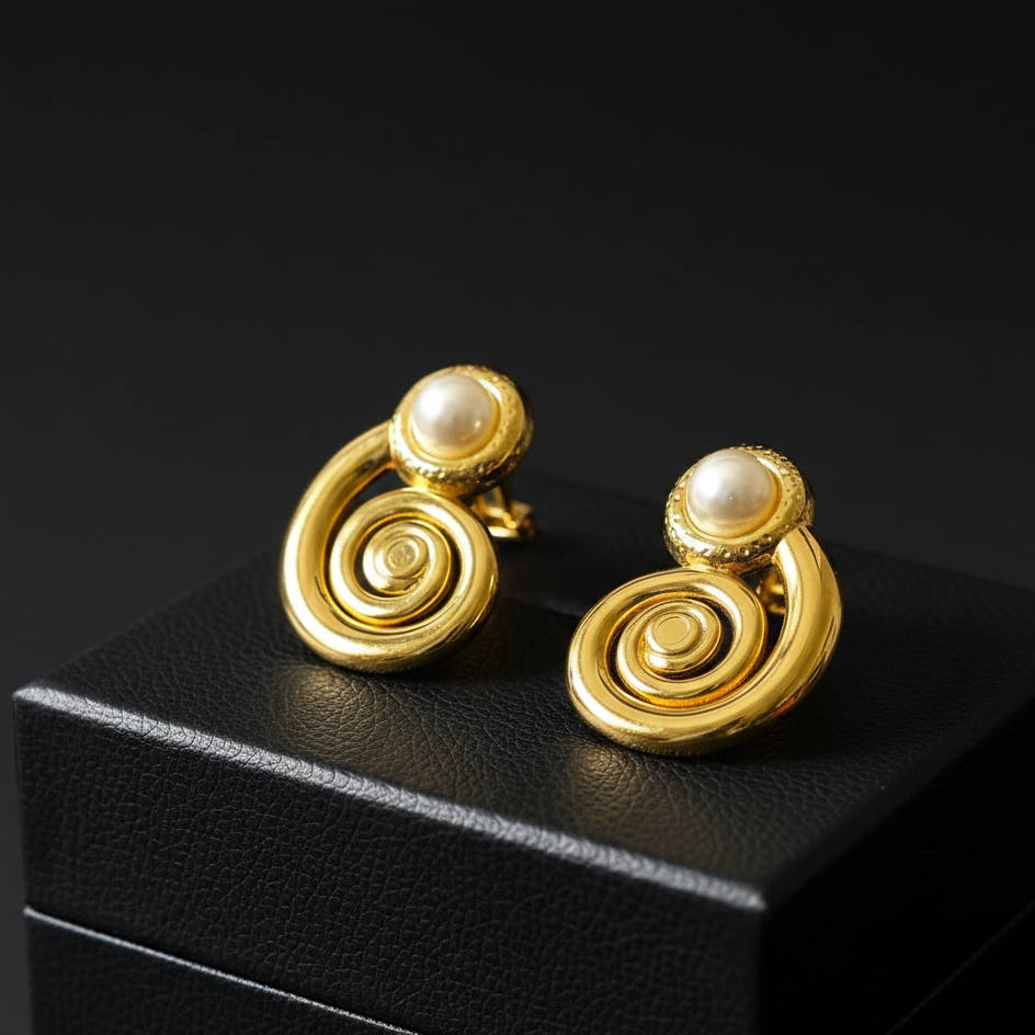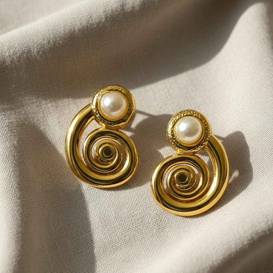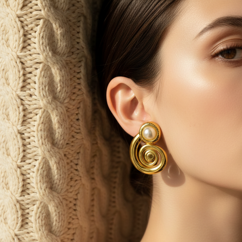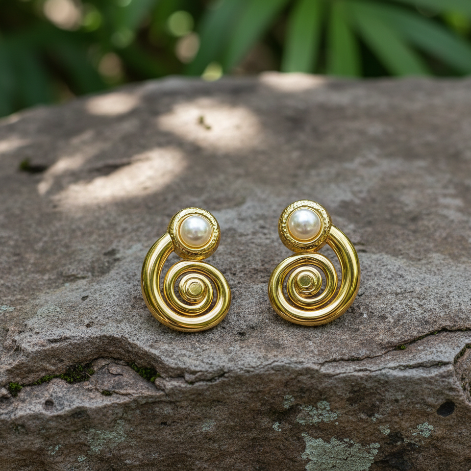A statement of timeless elegance, these earrings combine a classic pearl stud with a bold spiral drop in a rich gold finish. The sculpted circular form adds depth and movement, while the pearl brings a soft, refined touch. Designed to stand out without being overpowering, this piece is perfect for women who appreciate vintage-inspired luxury with a modern edge. Stone: Pearl Finish (Synthetic) Design Style: Spiral Drop with Pearl Accent Earring Type: Stud with Drop Finish: High Polish