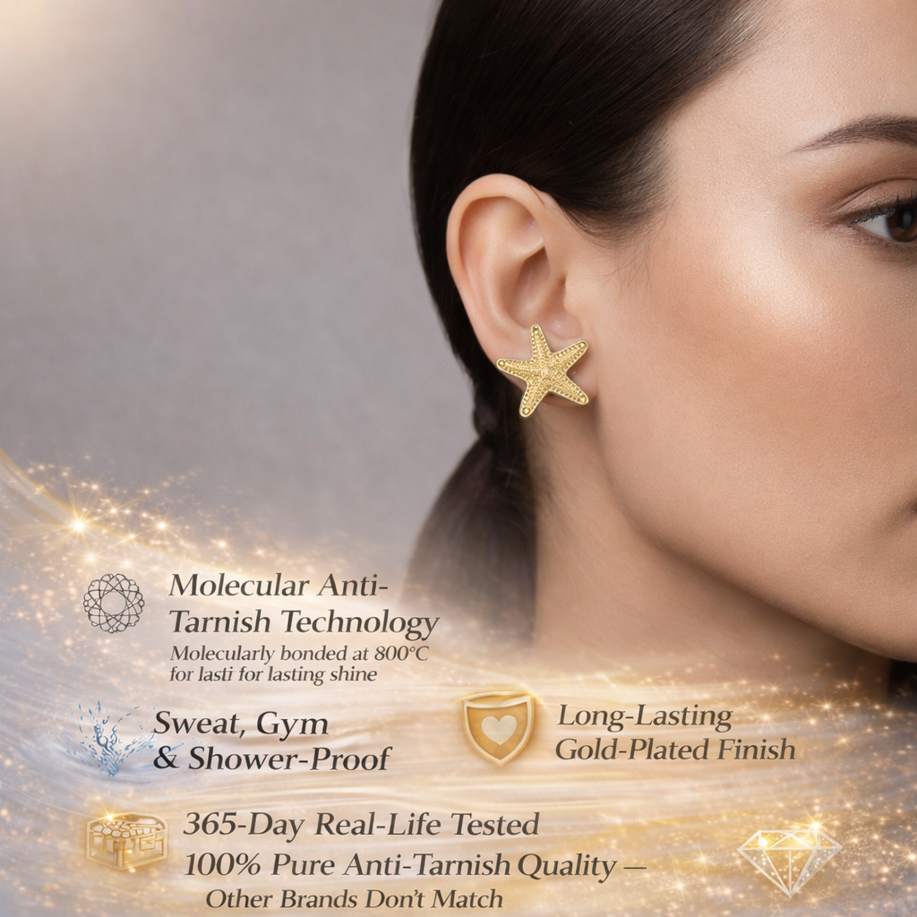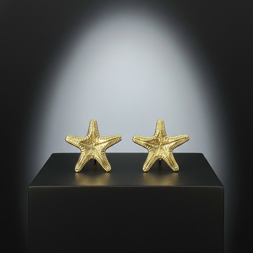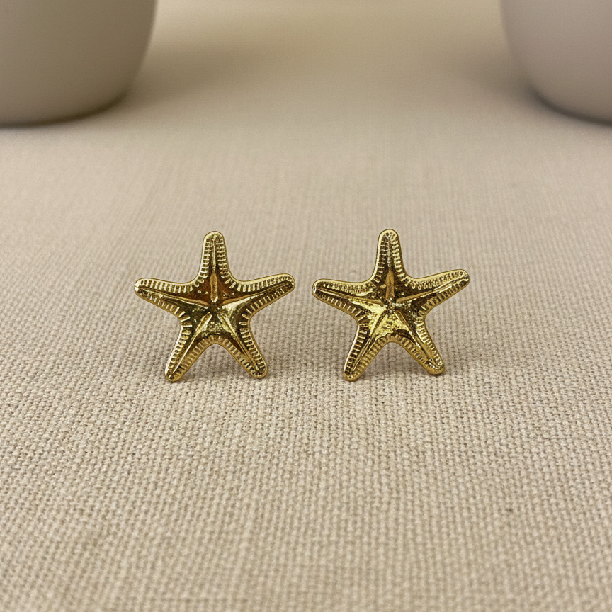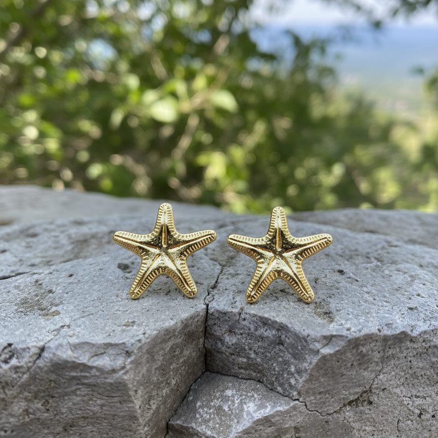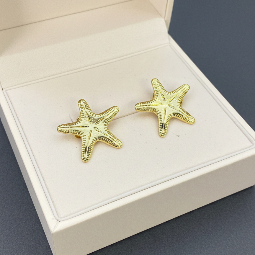 Playful yet elegant, these starfish-shaped stud earrings are inspired by coastal charm and effortless style. Crafted in a rich gold tone with textured detailing, the sculpted design reflects light beautifully while adding a unique statement to your look. Lightweight and easy to wear, they are perfect for everyday styling, vacations, or adding a fun accent to casual outfits. Design Style: Starfish / Nautical Motif Earring Type: Stud Finish: Textured High Polish