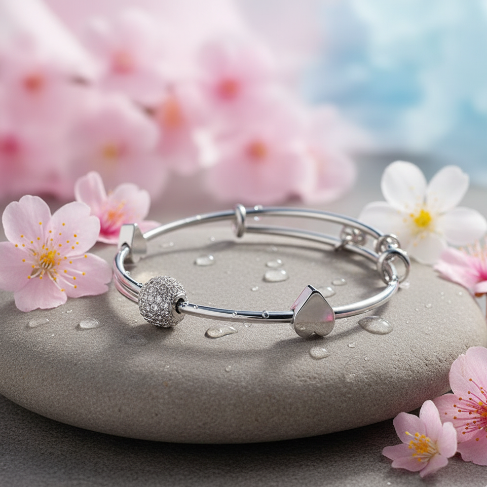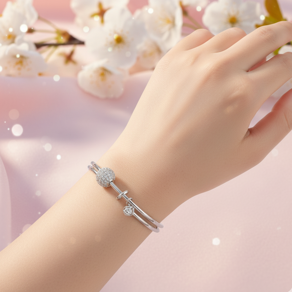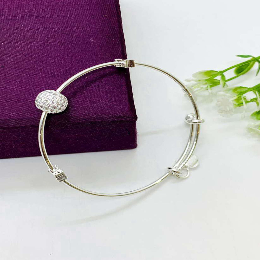 This stunning silver-toned bracelet features a sleek, adjustable bangle-style design adorned with a central bead studded with Korean crystals — offering a beautiful sparkle reminiscent of cubic zirconia.