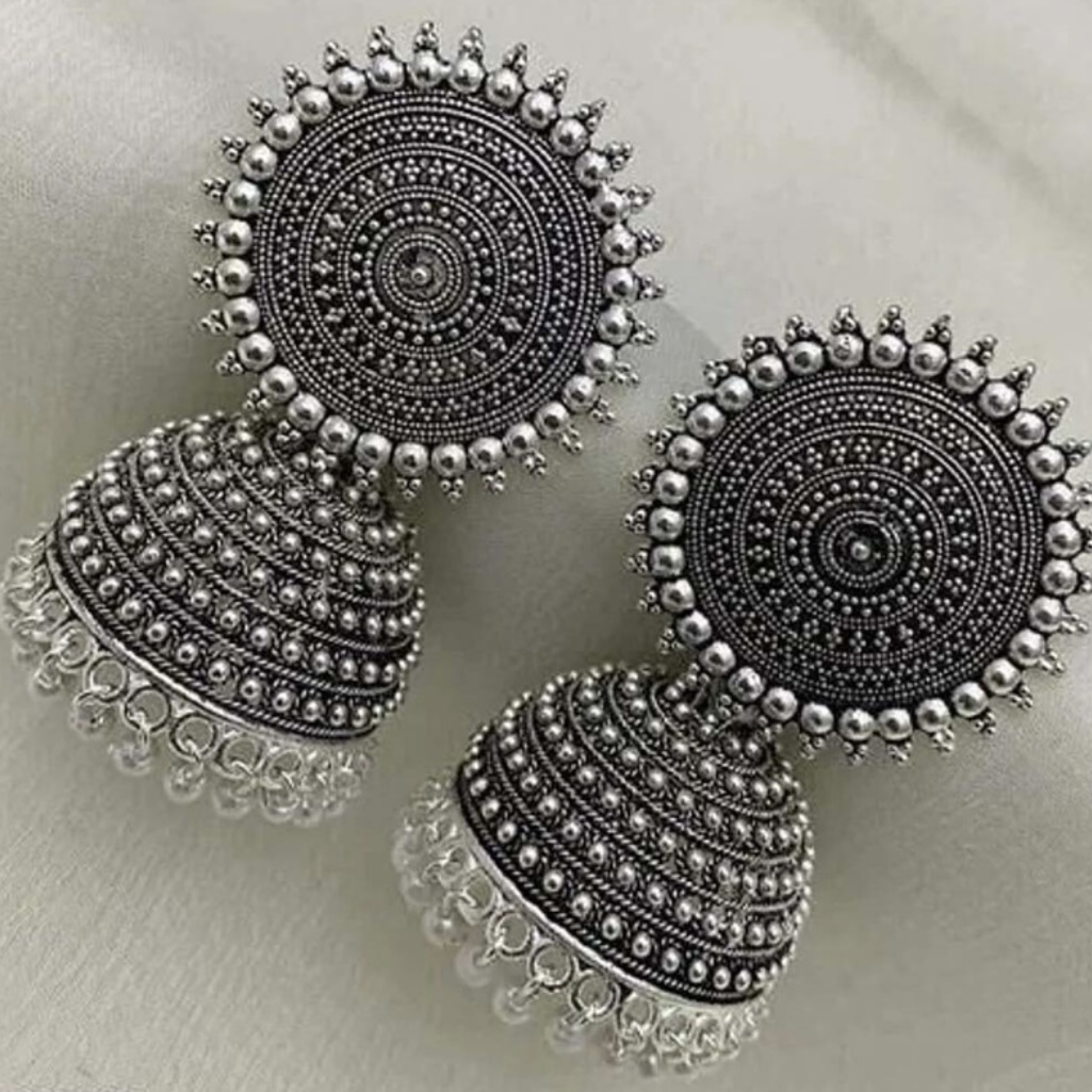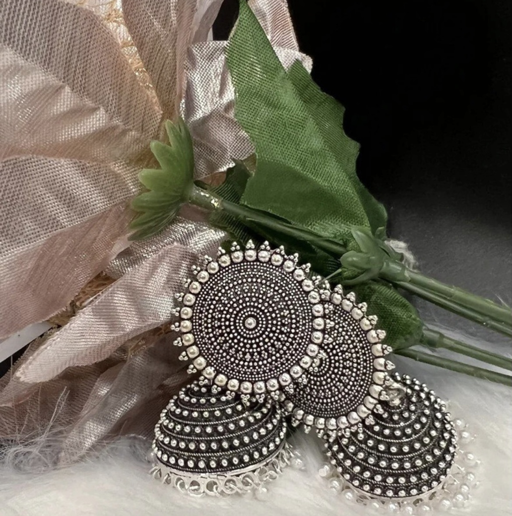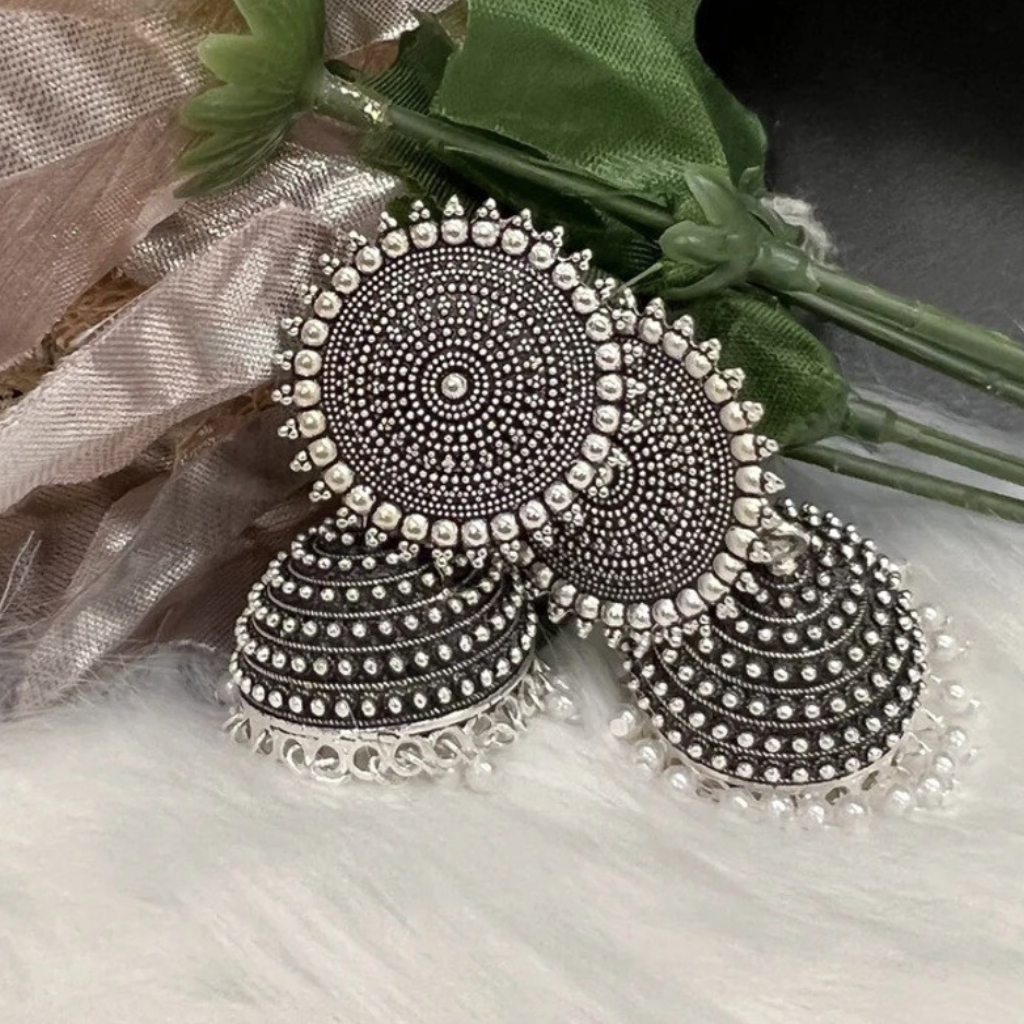 These striking Oxidized Silver Jhumka Earrings are a perfect blend of traditional Indian craftsmanship and modern style. The bold, antique finish gives them a rich, vintage appeal that is highly versatile. They feature a decorative circular stud with elaborate, mesmerizing geometric patterns connected to the iconic bell-shaped Jhumka. These statement earrings are an excellent accessory to complement both ethnic Indian wear and contemporary fusion outfits.