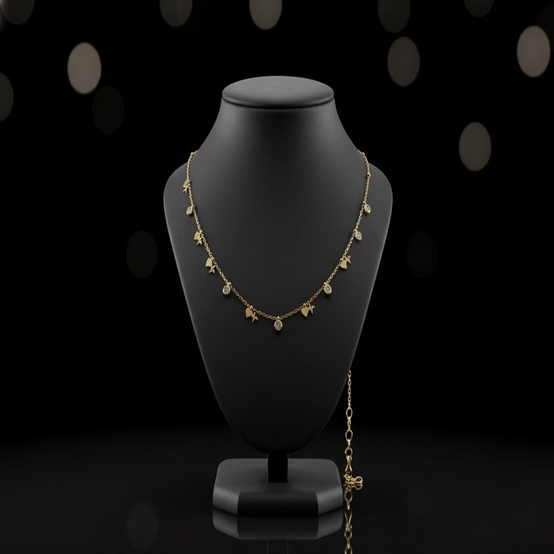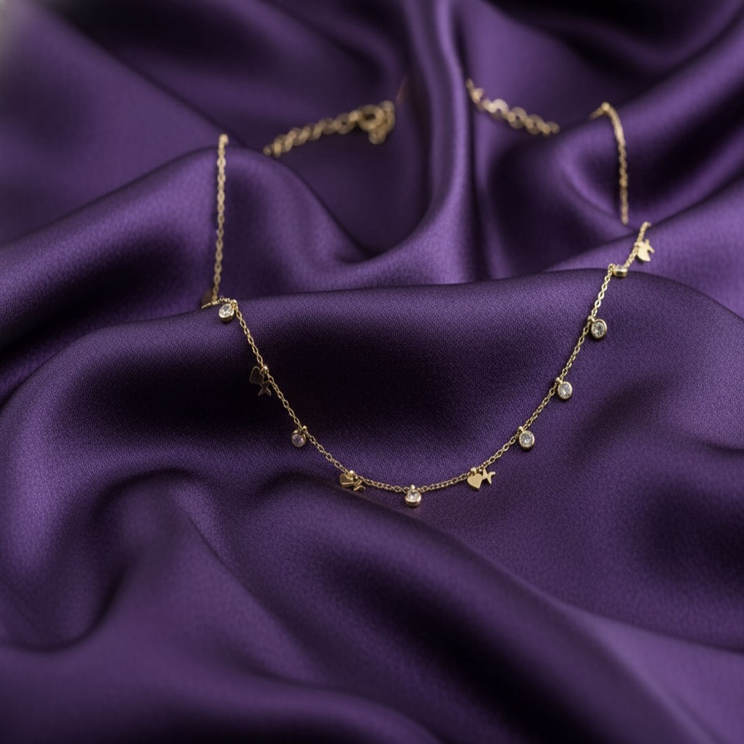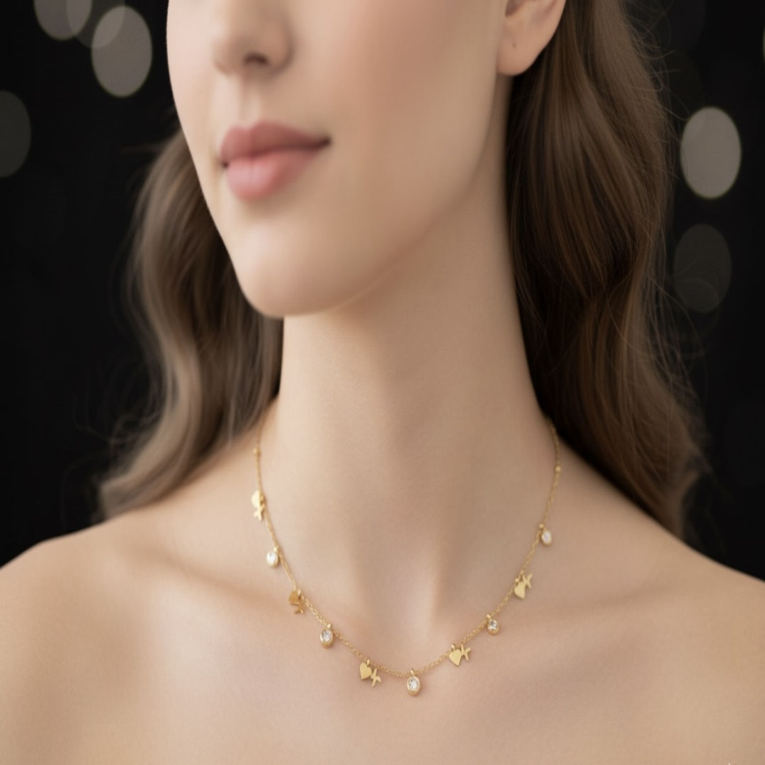 Grace your neckline with the delicate charm of our HeartBeat Gleam Anti-Tarnish Necklace, a symbol of transformation, beauty, and light. Designed with intricate butterfly motifs and shimmering crystal drops, this necklace exudes elegance and grace in every sparkle. The soft golden tone adds a radiant glow, while its anti-tarnish coating ensures long-lasting shine — keeping you effortlessly stunning, day after day.