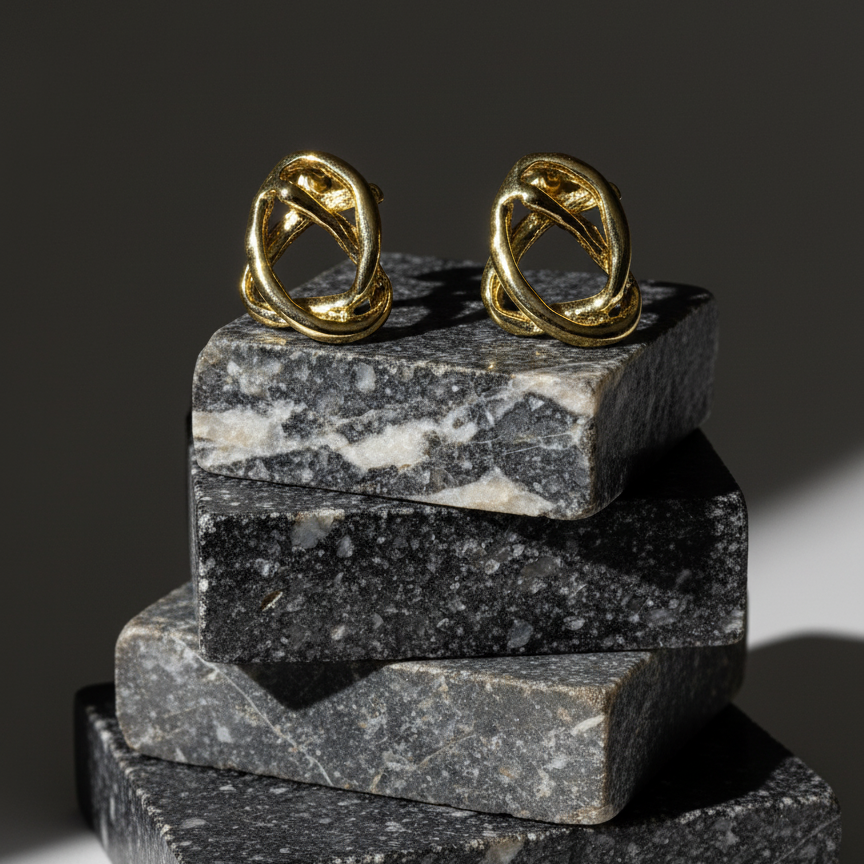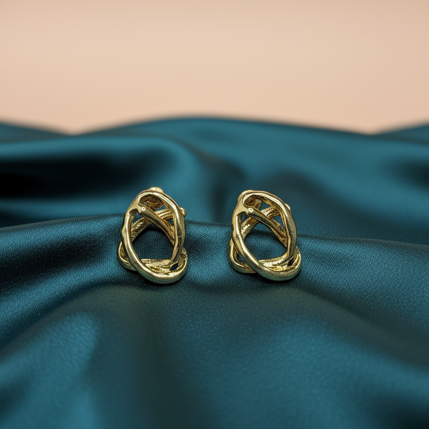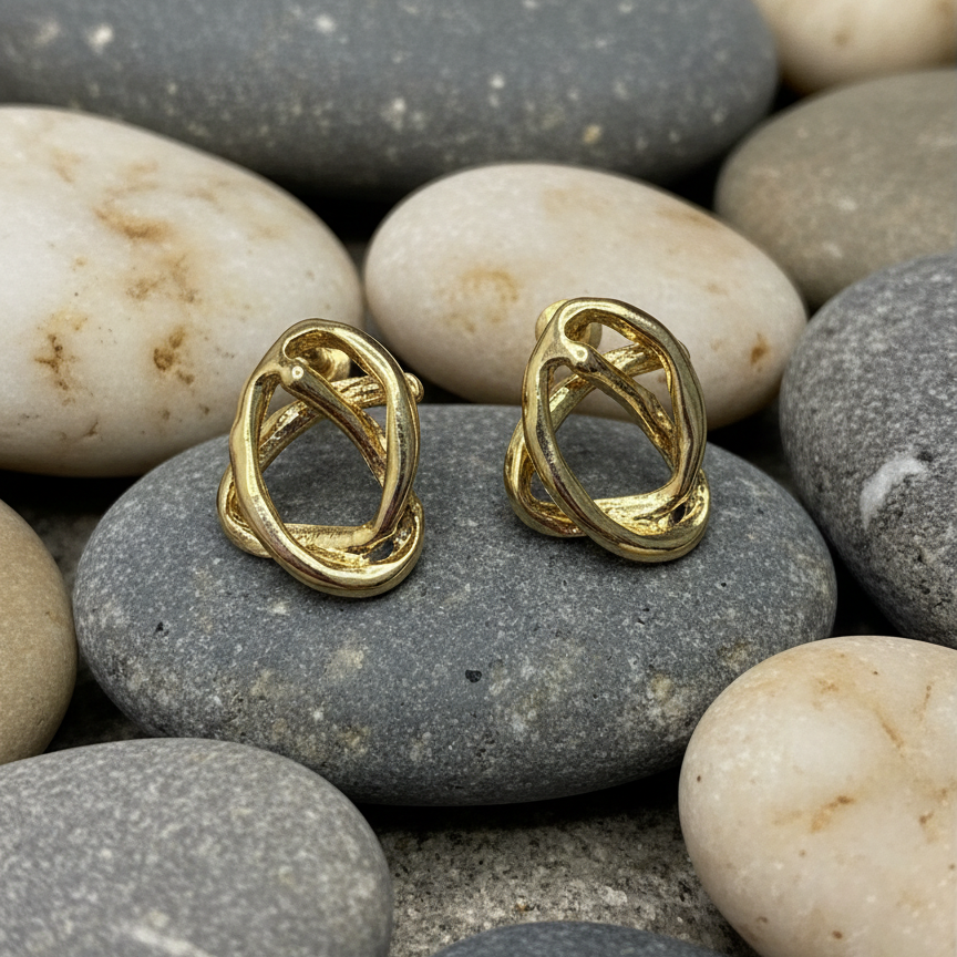 Description: Unique and modern stud earrings featuring a bold, sculptural design of two intertwined, ribbon-like loops that form an abstract knot. Finished in a high-polish, anti-tarnish gold tone, these earrings offer a distinctive, textured look that is both sophisticated and contemporary.