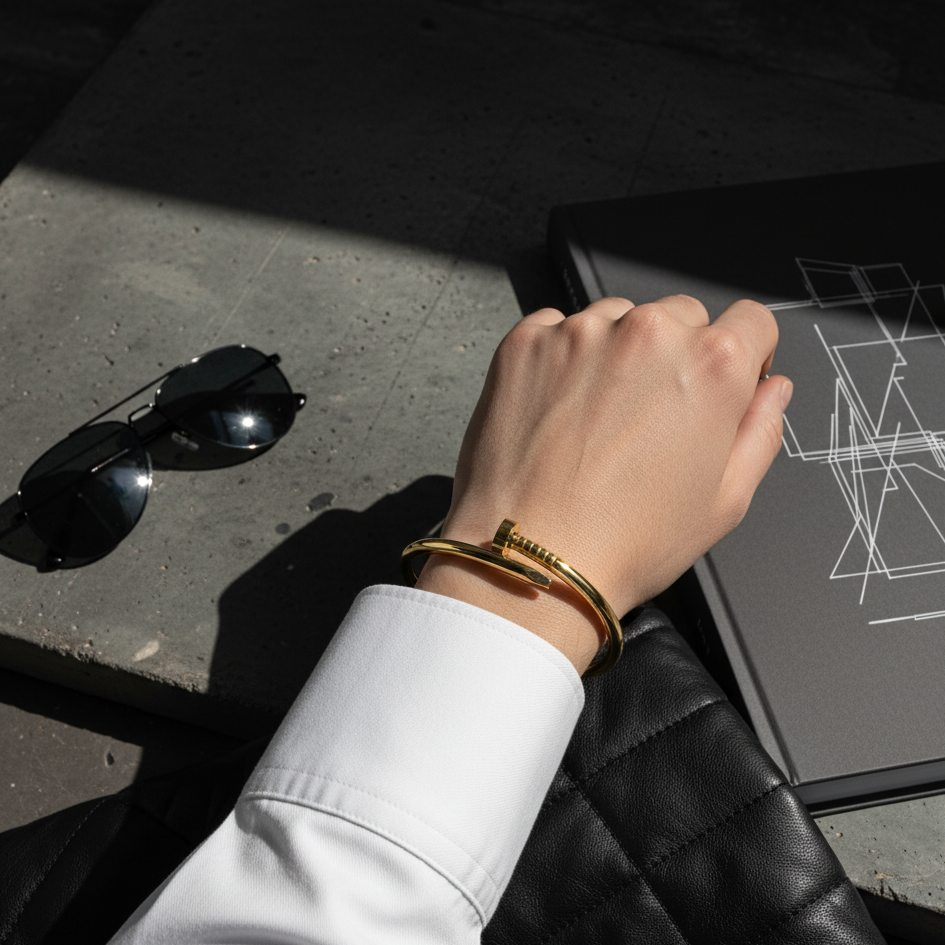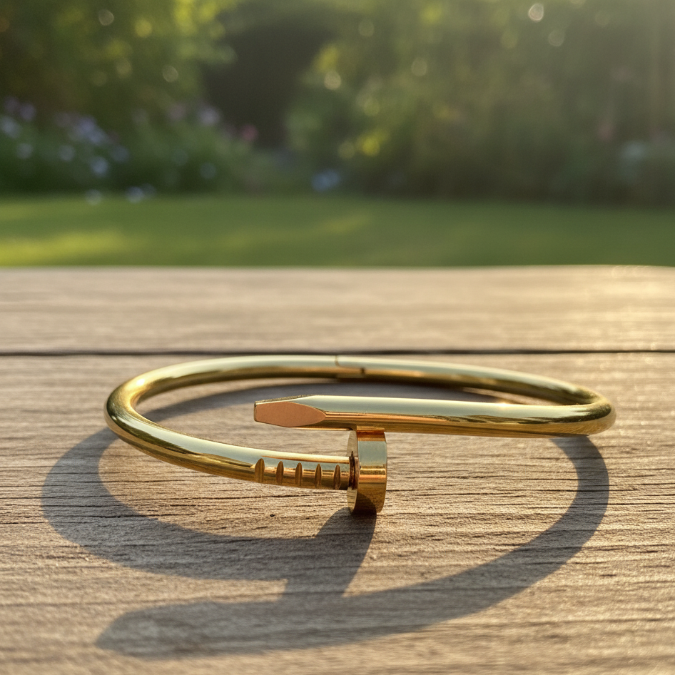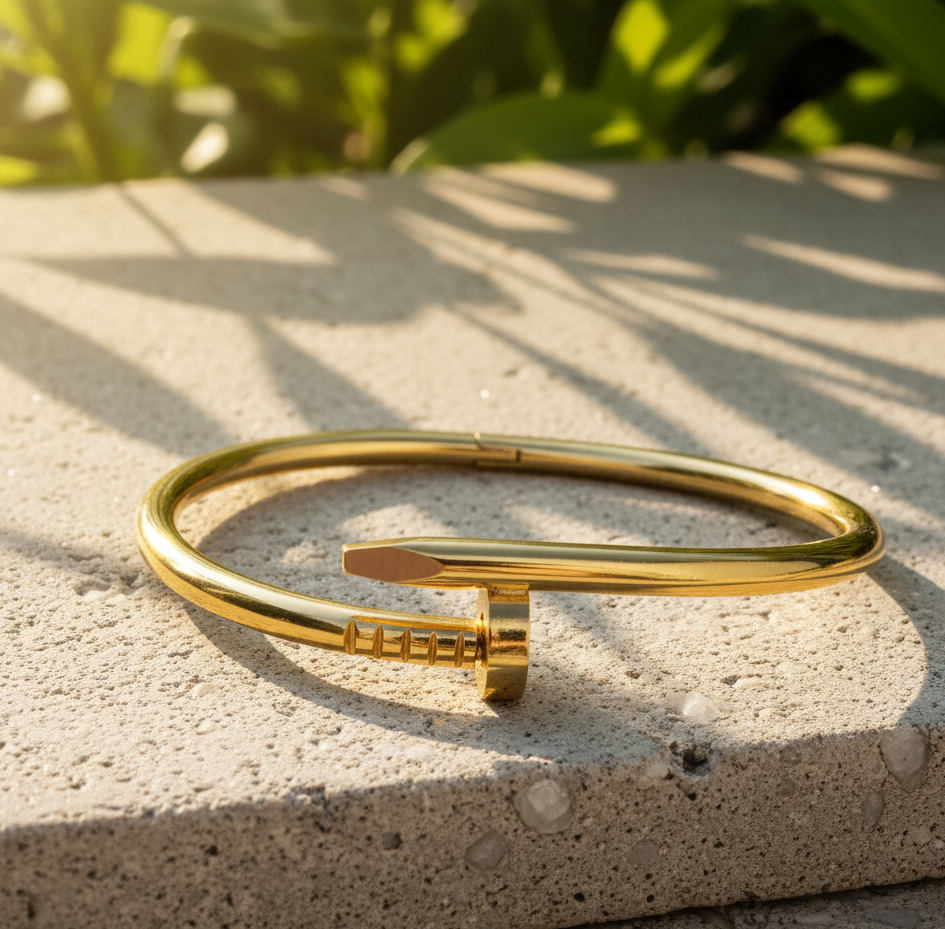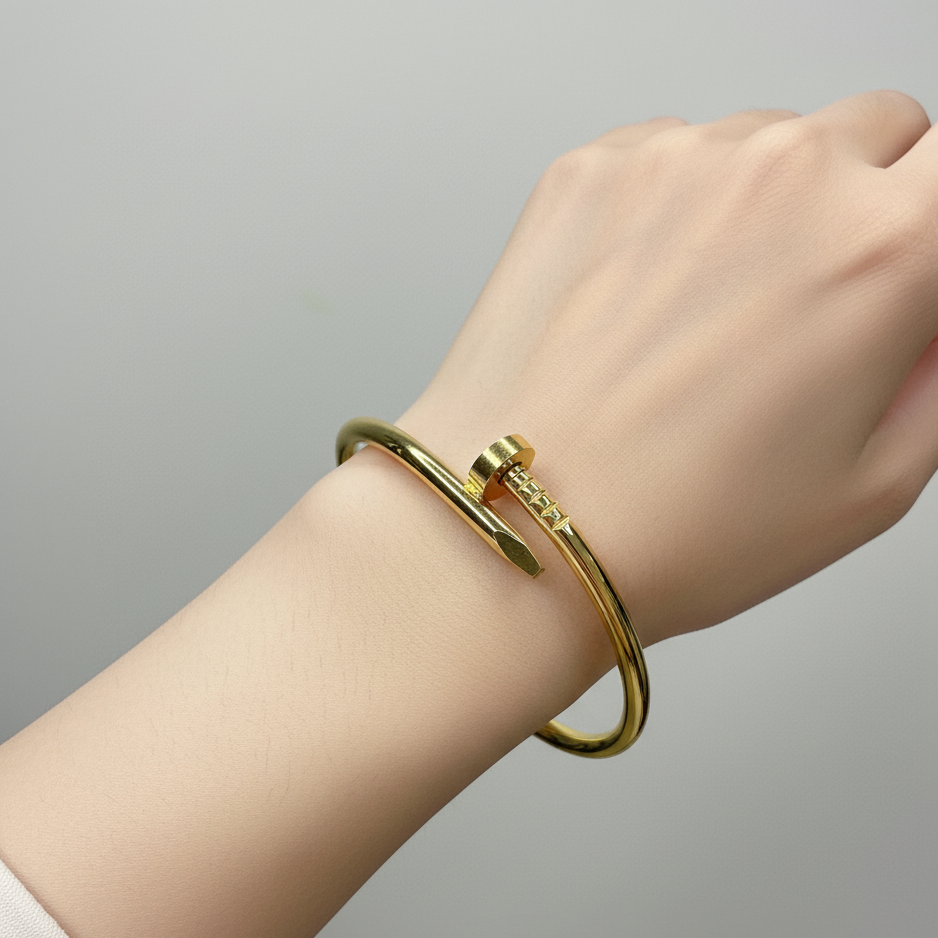 Description: This bold, iconic bracelet reinterprets a simple construction object into a striking piece of luxury wristwear. Crafted from anti-tarnish metal, this bangle is designed to look like a bent nail, featuring the distinct flat head and pointed tip. The smooth, highly polished gold finish provides a substantial, high-fashion statement that exudes confident, unconventional style.