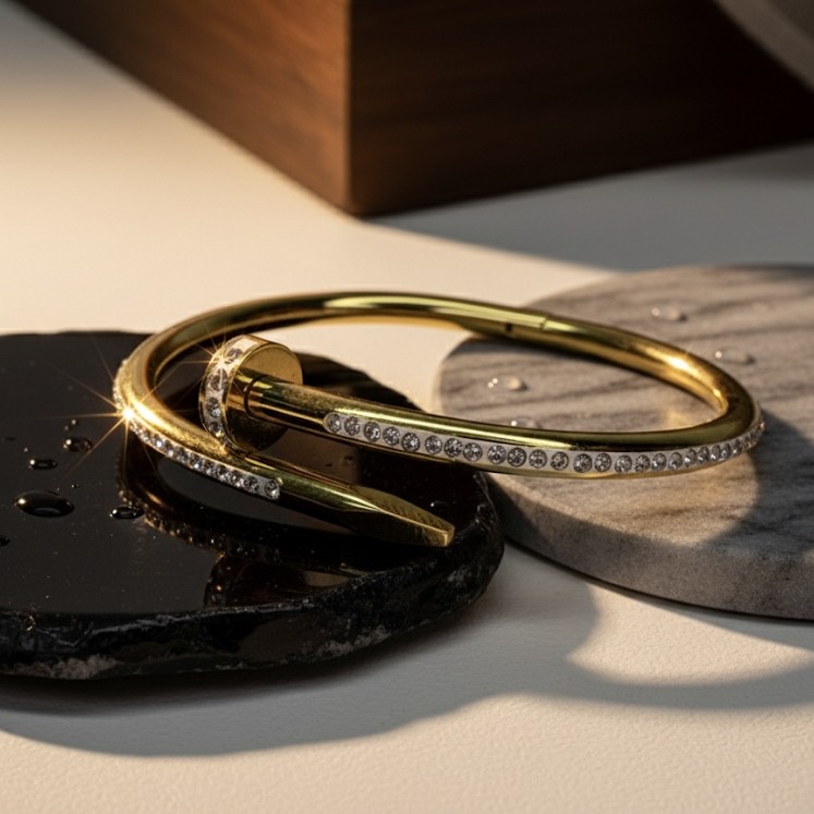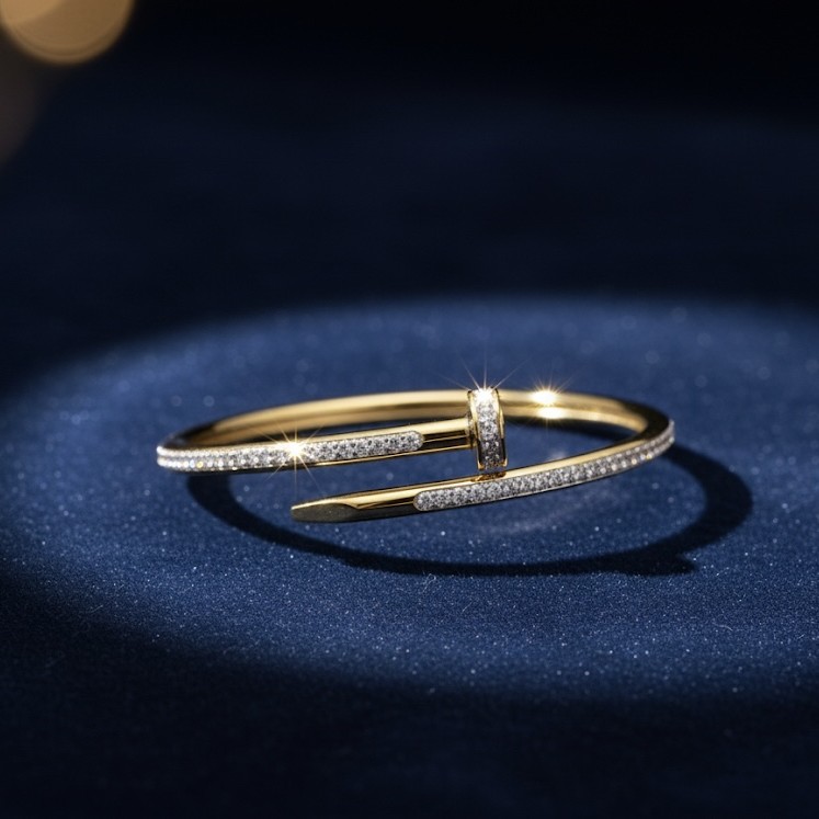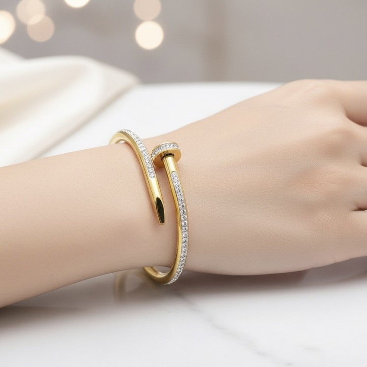 Description:This is a stunning, high-glamour take on the iconic nail-inspired design. Crafted with a brilliant anti-tarnish gold finish, this bangle features a sleek, curved structure detailed with a continuous line of micro-pave set cubic zirconia (CZ) stones that run along the length of the bracelet. Both the nail head and the pointed tip are fully encrusted in sparkle, creating a bold, eye-catching piece that perfectly merges edgy design with high luxury.