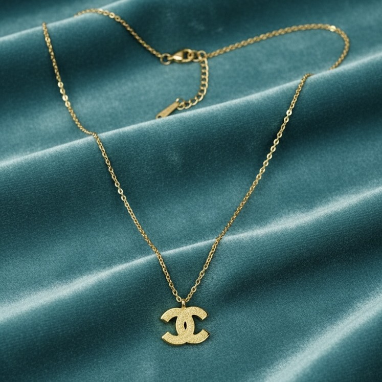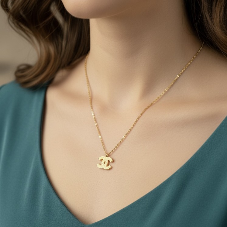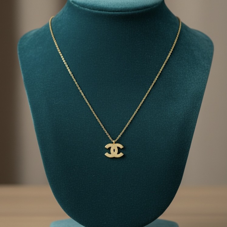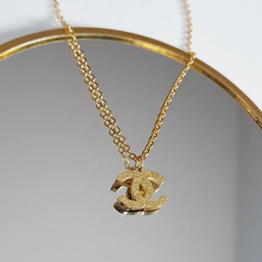 Description: A chic, gold-toned pendant necklace featuring an interlocking double 'C' design. The pendant has a distinctive, finely-textured or glitter-like surface, creating subtle sparkle and visual interest. Suspended from a fine, adjustable chain with a durable anti-tarnish finish, this piece is a sophisticated and fashionable everyday accessory.