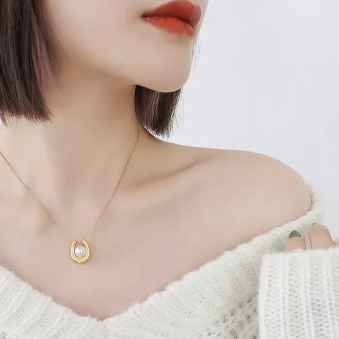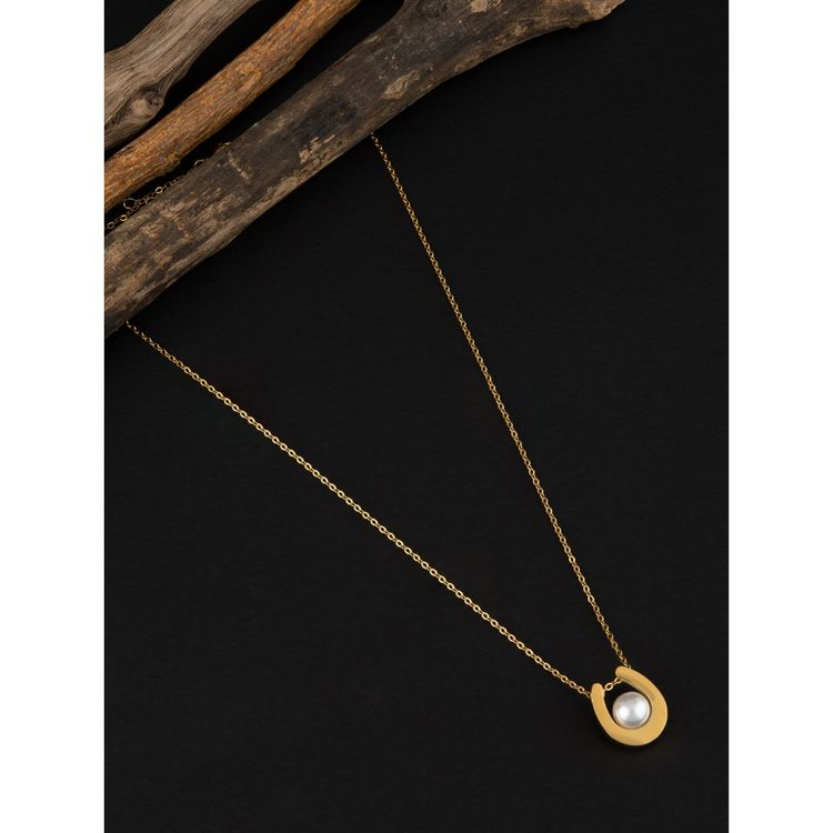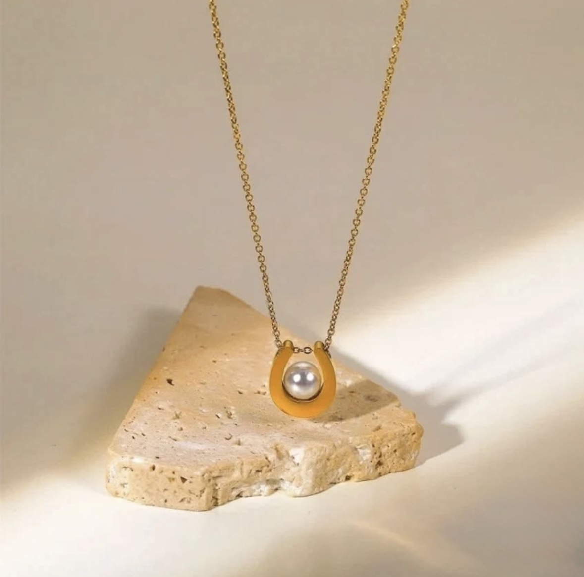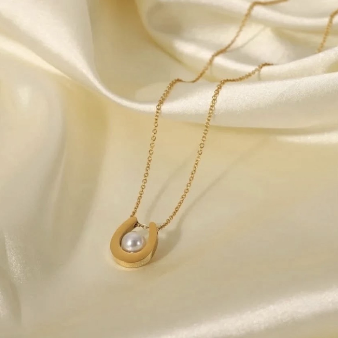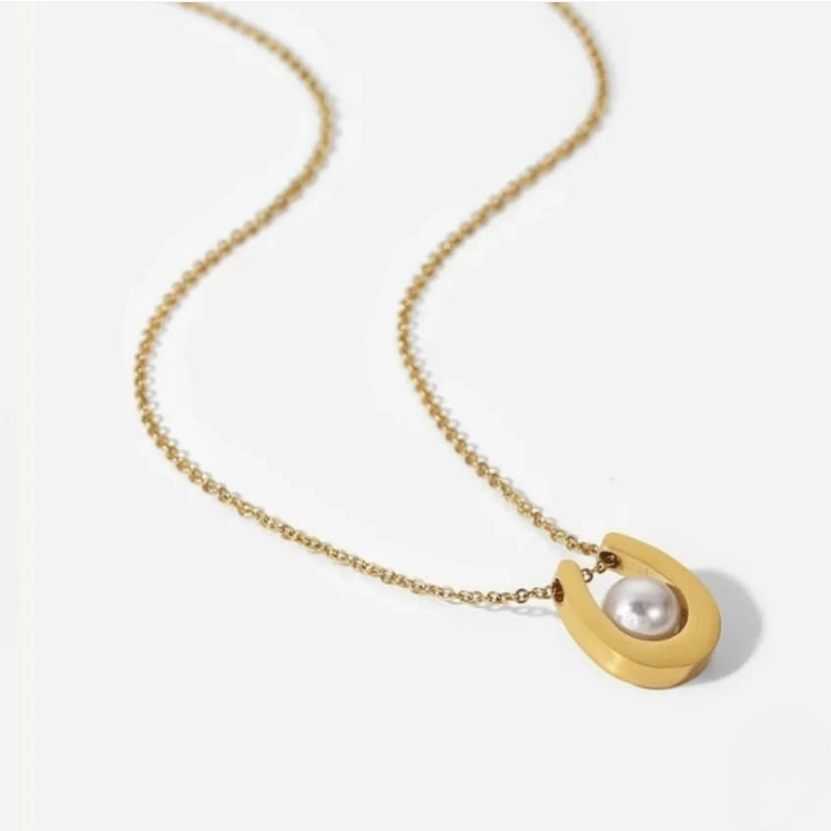Description: A charming, gold-toned pendant necklace featuring a horseshoe charm. The horseshoe is accented with a contrasting dark (black or deep brown) enamel border, while a small, lustrous faux pearl is nestled in the center. Suspended from a delicate, adjustable chain with a reliable anti-tarnish finish, this piece symbolizes good fortune and classic elegance.
