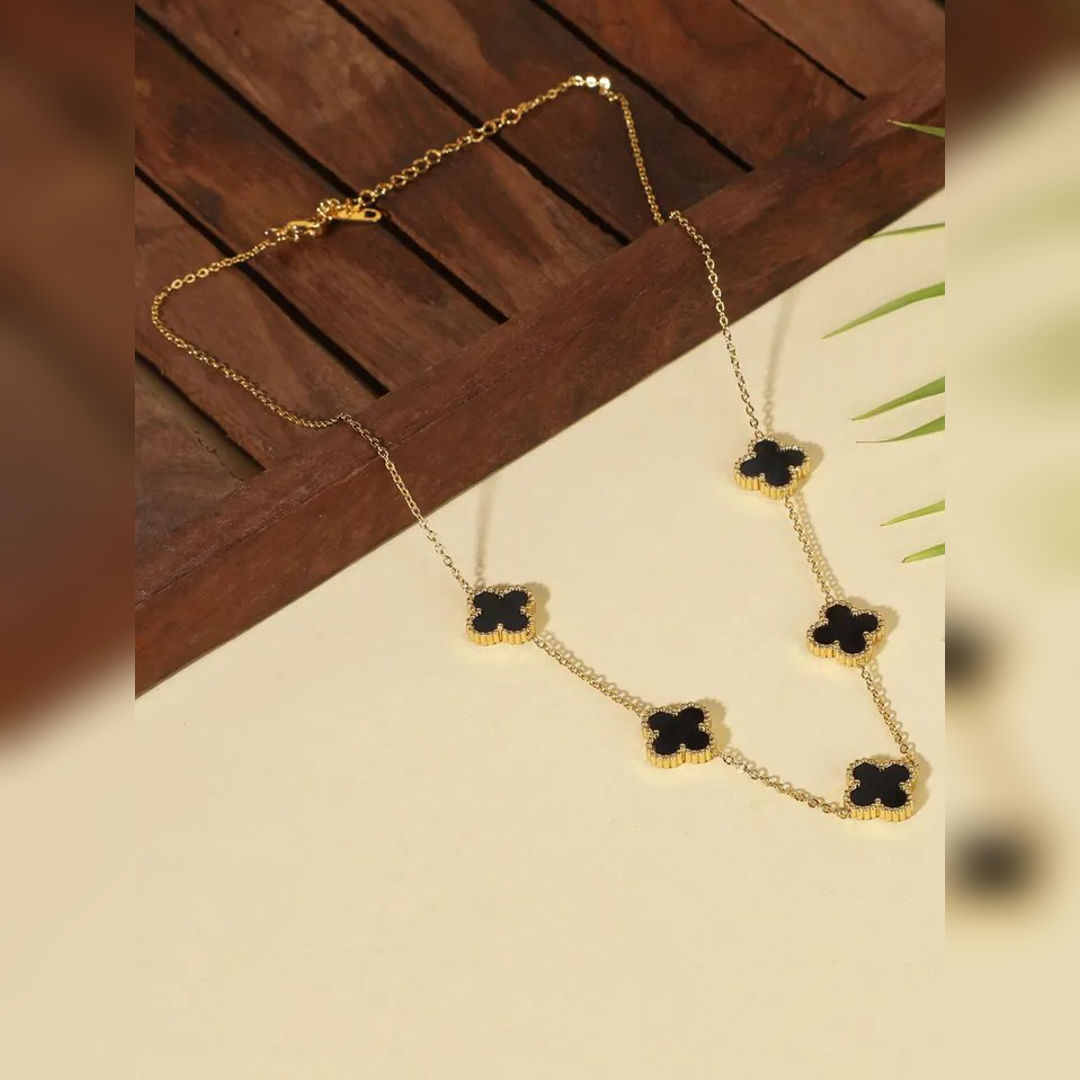 Grace your everyday style with the Pavona Ratna Classic Clover Elegance Set. Featuring delicate black clover motifs on a polished gold finish, this necklace and bracelet set adds a touch of refined charm to any outfit. Designed with an anti-tarnish coating, it’s made to stay beautiful wear after wear.