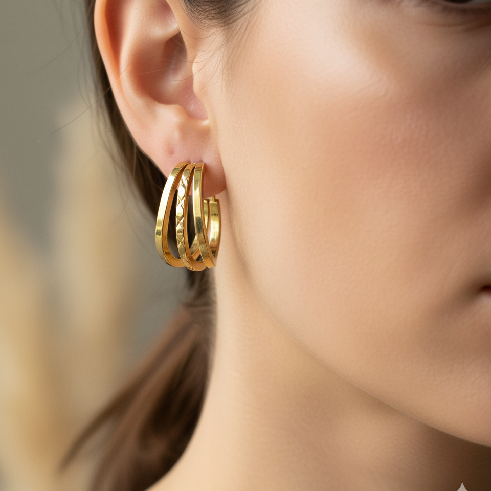 Description: This beautiful three-pair collection offers a harmonious blend of nature-inspired charm and contemporary statement style. The set includes whimsical Crystal Butterfly Studs and delicate Filigree Rose Studs for subtle, daily elegance, paired with a high-impact Layered Sculptural Hoop for when you want to make a bold impression. Crafted with a premium anti-tarnish gold finish, this versatile trio allows you to effortlessly switch between soft, feminine looks and modern, textured statements.