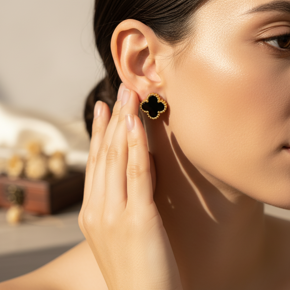 Style Tip: Embrace the drama by wearing the Triple Band Hoops with a structured blazer and tailored trousers. For a more subtle look, pair the Black Clover Studs with a crisp white shirt to let the classic black and gold contrast stand out.