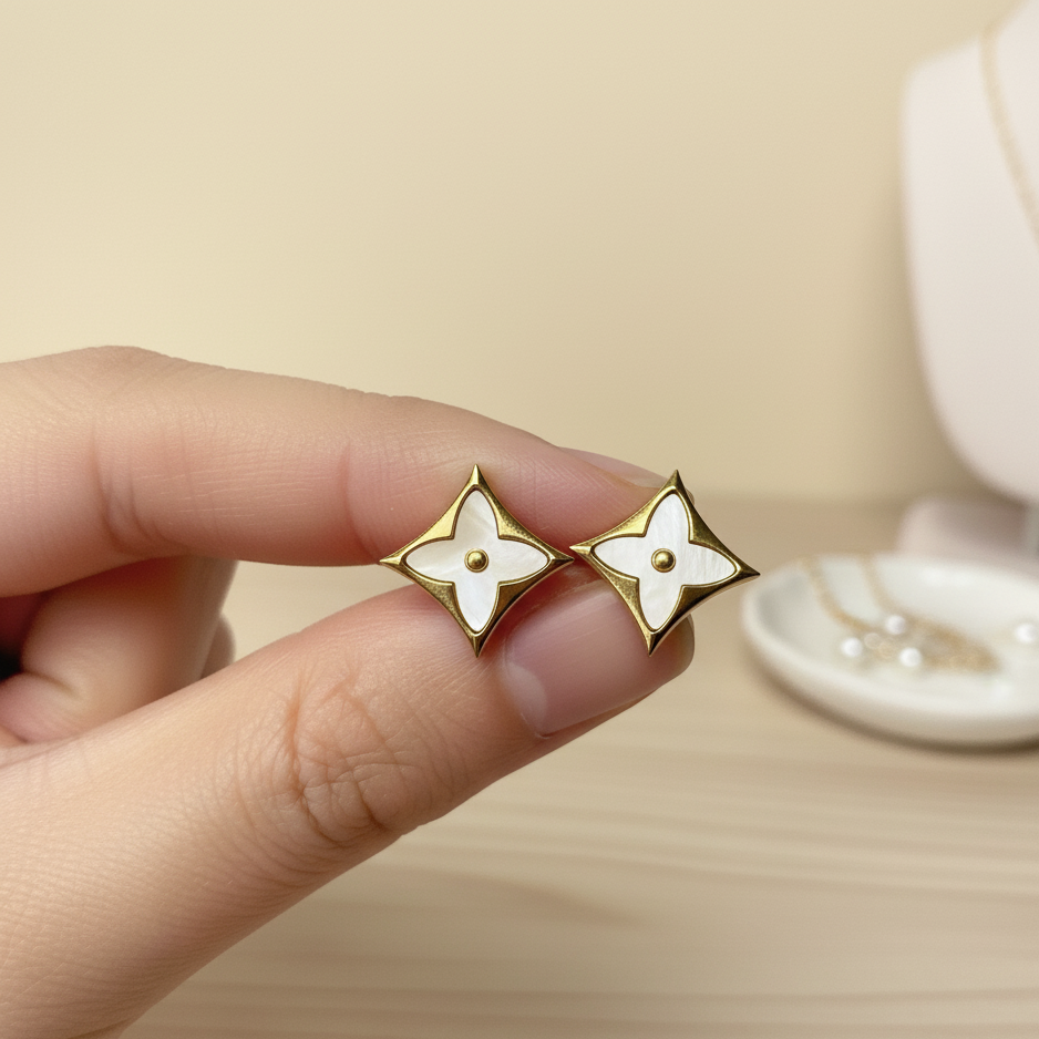 Description: Discover the perfect blend of natural elegance and whimsical charm with this exquisite three-pair earring set. It includes delicate Clover Dangle Hoops featuring luminous white shell, classic Star Studs with a pearlized inlay, and tiny, sweet Heart Studs. Each piece is finished in a high-quality, anti-tarnish gold tone, making this set a brilliant and durable choice for everyday wear, gifting, or building a romantic, layered ear stack.