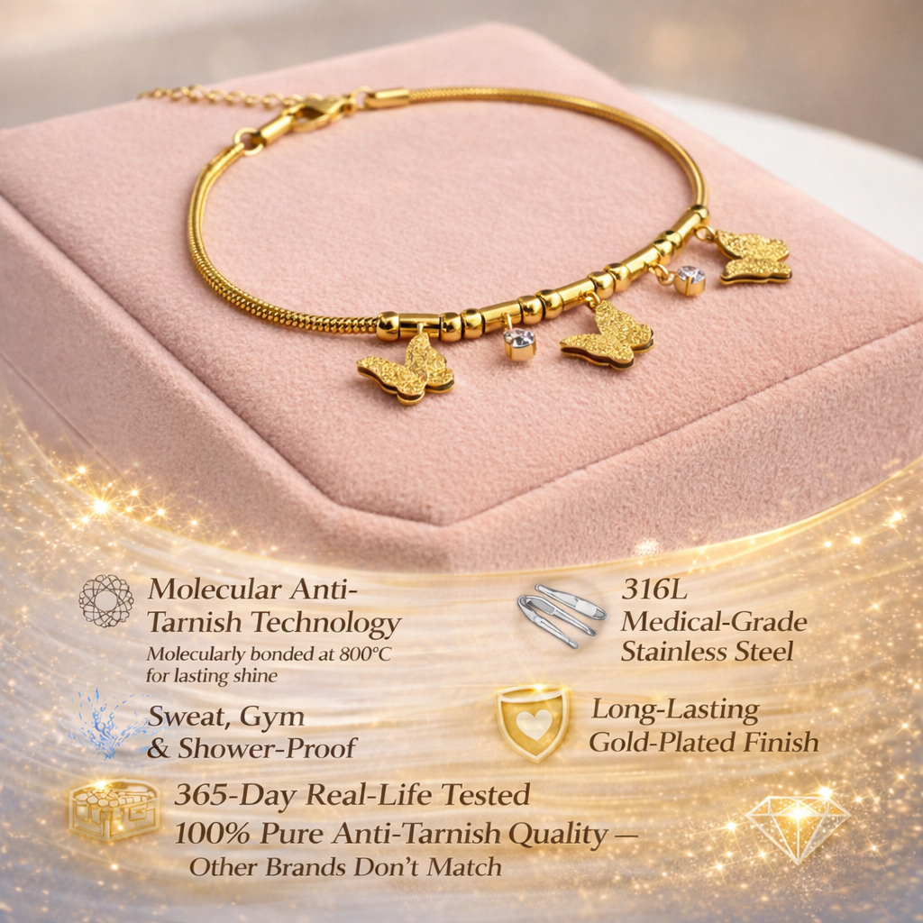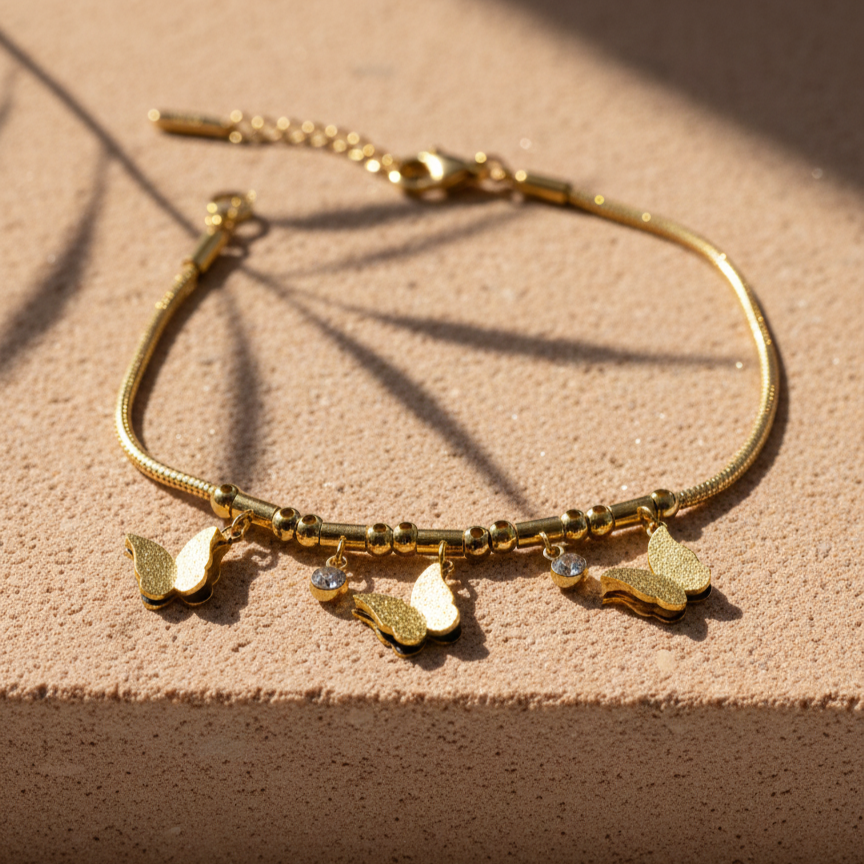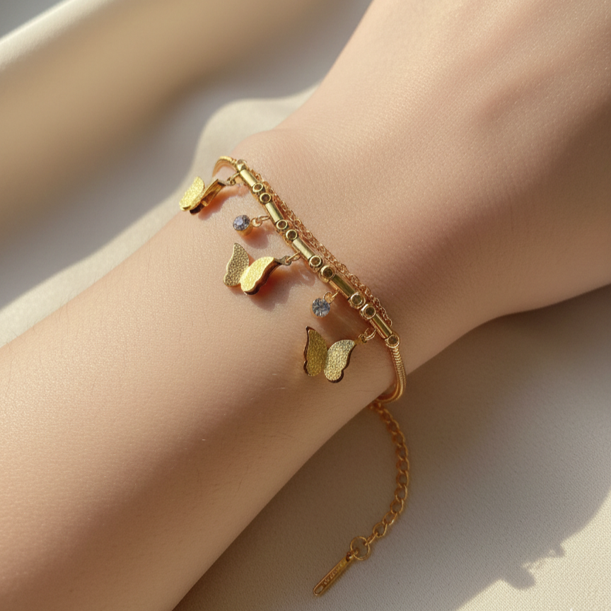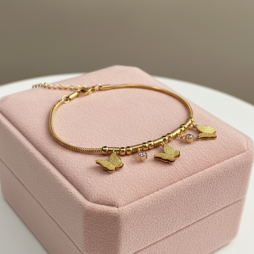 Delicate with a refined playful touch. This bracelet features a sleek gold-toned band accented with textured butterfly charms and subtle crystal drops, creating gentle movement and sparkle around the wrist. Designed for women who enjoy feminine jewellery with a modern finish, it offers effortless elegance suitable for both everyday wear and special moments.