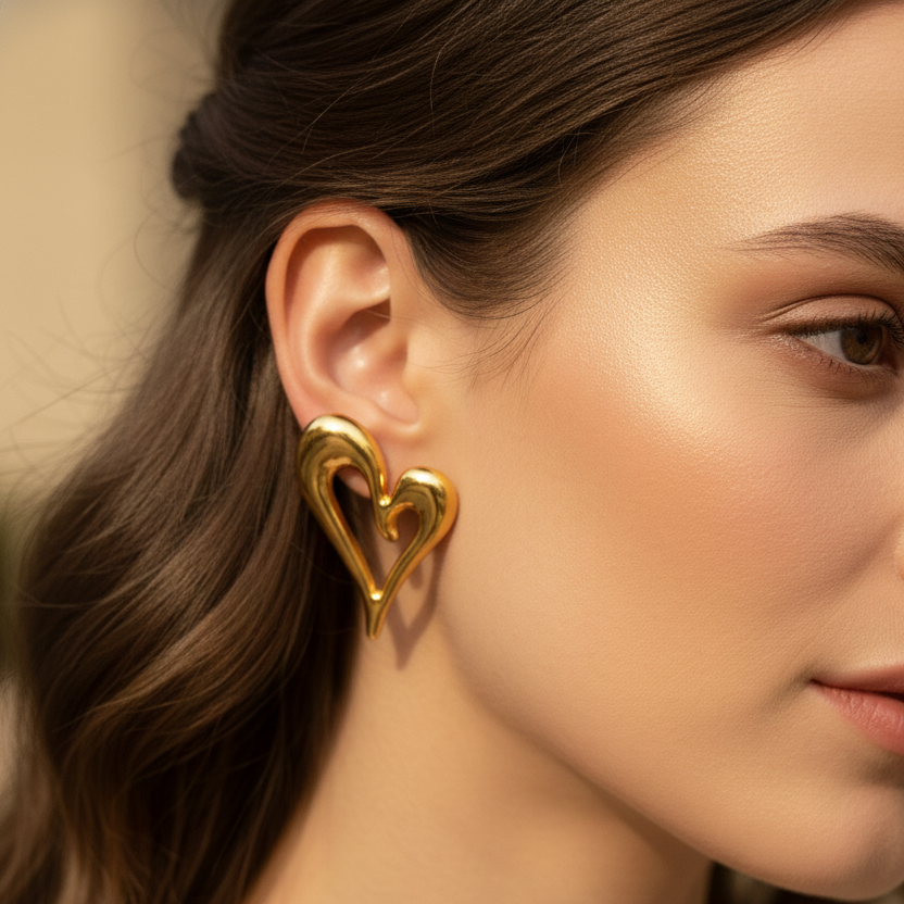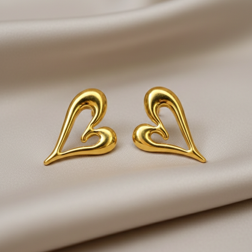 Minimal yet expressive, these abstract heart-shaped stud earrings feature a smooth, fluid gold silhouette with a modern artistic twist. The open, asymmetrical heart design adds a contemporary edge while keeping the look elegant and lightweight—perfect for effortless everyday styling or subtle romantic flair. Earring Type: Stud Earrings Finish: High-Polish Gloss